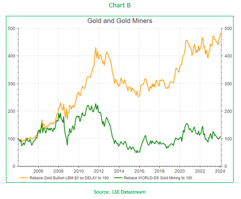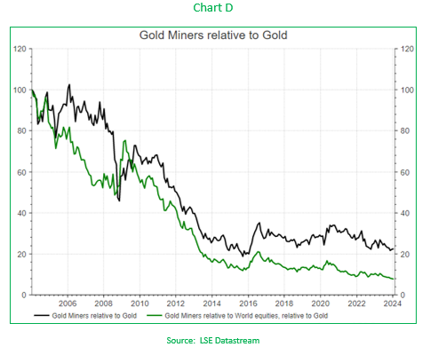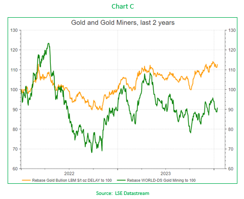 Over the last 20 years, the two have followed very different paths (Chart B), with the last two years seeing the gold miners sector lag the rally in the physical price of gold (Chart C).