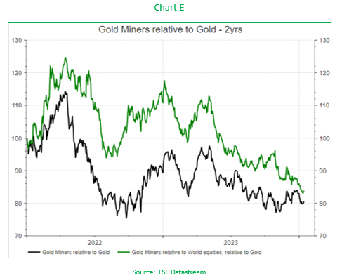This underperformance becomes even more apparent when you look at a ‘price relative chart’, one that shows the relative performance of the gold mining sector to gold, and the relative performance of the sector relative to global equites (which is then compared to gold). Over both a shorter and longer-term time period (shown in Charts D and E respectively), gold miners have become disconnected from the price of gold.