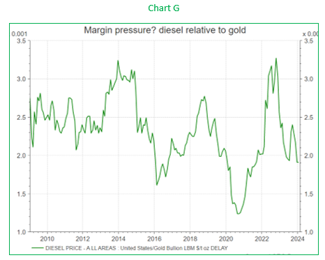 Chart F and Chart G help to illustrate this point. Chart F shows that diesel prices are now in negative territory year-on-year, which is a completely different perspective to the ‘eye watering’ levels of 2022.  Chart G compares diesel prices to gold – the lower the line in the chart, the better the outlook for gold miners’ margins.